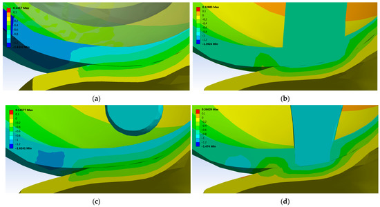 Directional deformation in Z axis of femoral and tibial cartilage after applying a normal pressure of 0.38 MPa: (a) Case 0 (healthy knee); (b) Case 1 (just porous Collagen); (c) Case 2 (Collagen + BMC); (d) Case 3 (Collagen + ASC).