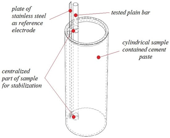 For the modified bond strength test, a pull-out test method was used (loading and evaluation of test results according to RILEM RC6 [39] and ASTM C234-91a [40]), cylindrical specimens of PLA Filament (see Figure 1 and Figure 2) with wall thickness 0.5 cm, inner diameter 9.5 cm, and height 21.0 cm were fabricated. The anchorage of the plain bars to the axis of the test cylinders for bond strength tests was provided on opposite sides of the cylindrical mold (holes for the plain bars to be threaded through). At the same time, an additional narrower hole was created (top) in the same areas to guide a plate of stainless steel (FeCr18Ni9-Goodfellow metals, Huntingdon, UK) as a reference electrode for Ecorr measurements. The distance between the surface of the plain bar and the plate of stainless steel (reference electrode) was 5 mm. The bottom of the mold was closed with a cap (PE) which had a hole for the plain bar to be threaded through. These cylindrical bodies and the adjacent caps (bottom side of the mold) were printed on a 3D printer (Prusa i3MK3S+ - Prusa Research, Prague, Czech Republic). In this way, a total of 28 bodies were created (7 for each intention—see Table 4). The test specimens were placed above the water surface in an open grid (closed plastic box—95% RH). The open-circuit potential of FeCr18Ni9 plates versus SCE (saturated calomel electrode) was measured in simulated concrete pore solutions at pH 12.8 with graded amounts of MnO4−. The readout of the potential of the stainless steel (multimeter—OWON B35 (T)) plate versus SCE was taken after approximately 30 min of exposure (see Table 5). For the actual expression of the Ecorr time course, a conversion to the SCE reference value was performed using the average measured value (last detail in Table 5). With gradually increasing amounts of MnO4− in simulated concrete pore solutions, values of potential difference between (FeCr18Ni9)/SCE increase. An increase in a similar range of values (as shown in Table 5) was also verified in the cement paste used to make the cylindrical samples.
