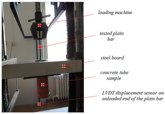 The bond strength between the plain bars and a cement paste is determined by measuring the bond stress slip (LVDT sensor—Micro-Epsilon Messtechnik GmbH, Ortenburg, Germany) on the unloaded end of plain bars by loading device TIRA test 100 kN (viz Figure 3). The test was controlled by displacement of the unloaded end of a reinforcing bar. A constant loading rate of 0.005 mm s−1 was applied. The setup of the pull-out test is displayed in Figure 3. The test was terminated after reaching a slip of 1.6 mm.