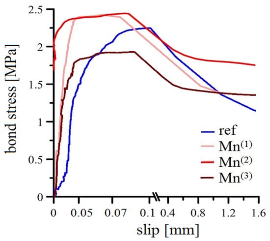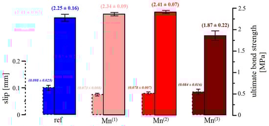 The results of the modified pull-out test are summarized in Figure 9 and Figure 10. Figure 9 shows the average bond stress versus slip curves for a set of specimens embedded in cement paste without MnO4− (ref) and with a graded addition of this oxidant (Mn(1)–Mn(3)). Subsequently, the bar chart in Figure 10 evaluates the measured average ultimate bond strength values (solid line bar boundary; larger bar width) as well as the measured average slip readings for the ultimate bond strength determination (dashed line bar boundary; smaller bar width).