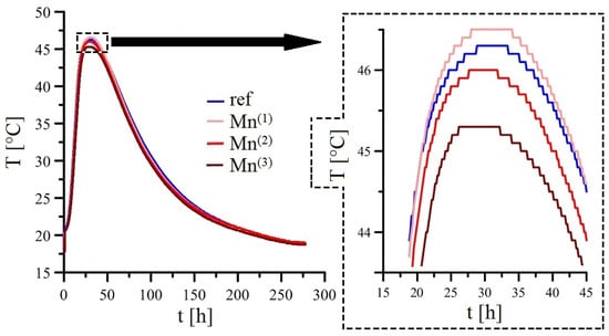 Figure 11 shows the results of the measurement of the temperature change of the concrete samples during hydration. The results shown are the average curves obtained from parallel groups of test specimens from concrete mixtures without MnO4− and with graded additions of these anions. From the measured results, it is clear that additions of KMnO4 to the premixed water in the range of 10−4 mol·L−1 and 10−3 mol·L−1 have no effect on the evolution of the heat of hydration during cement hydration (with respect to the reference exposure). This is evident both in terms of the measured maximum temperature values reached by the concrete samples and the coincident time at which these global maxima are measured, as well as in terms of the progression of the curve at later time points during the hydration of the concrete samples. In the case of the highest addition of MnO4− anions to the mortar water (10−2 mol·L−1—Mn(3)), there is a slight decrease in the maximum temperatures reached by the concrete samples compared to the other mortars by approximately 6%. However, the time course of the temperature evolution curve for the test samples of the mortar with the highest content of KMnO4 in the mortar water indicates the same hydration time and the actual hydration process as for the other mortars. It is clear that the highest additions of KMnO4 to concrete samples slightly affect the acceleration period (accelerated heat evolution before maximum (first) peak); the effect on the dormant period of the heat evolution is already quite negligible [87].