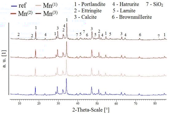 To verify possible changes in the composition of the hydrated phases of the cement paste in the case of KMnO4 additions, a comparative XRD analysis was performed on the paste samples after 28 days of maturation. The results of the actual X-ray diffraction analysis are summarized in Figure 12. It is clear from the results that there is no obvious change in the composition of the cement paste after this exposure, even with the addition of 10−2 mol·L−1 (Mn(3)) to the premixed water. In situ X-ray diffraction has been successfully used to evaluate the retardation effect of polymeric substances on cement hydration [77].