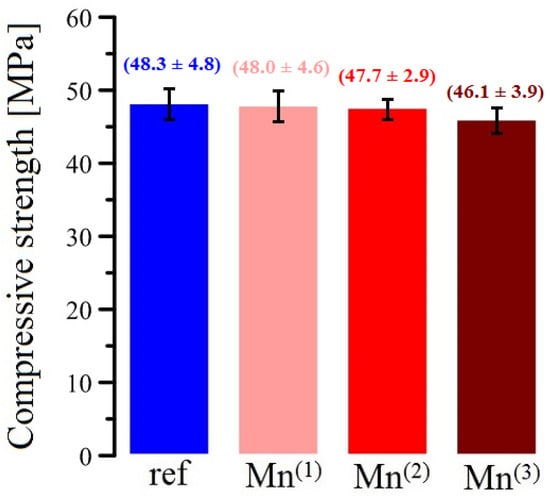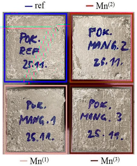When fresh concrete containing KMnO4 was mixed in mortar water, a slight change in consistency was observed compared to the reference mortar without the addition of this substance. The consistency of the fresh concrete was determined according to EN 12350-2, Part 2: Settling test [83]. The cone settlement value of the reference mix was 40 mm, corresponding to a consistency level of S1 according to EN 206 + A2 [84]. The cone settlement values of the material containing KMnO4 were 50 mm (Mn(1) and Mn(2)) to 60 mm (Mn(3)), corresponding to a consistency level of S2. The addition of KMnO4 to the mortar water may have a slight plasticizing effect but is more likely to result in so-called concrete bleeding [85,86]. However, there is no significant dewatering, even in Mn(3) mixtures, which would result in a negative effect on the mechanical and physical parameters of the resulting hardened concrete.