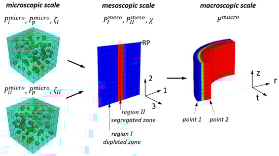 The models used to describe residual stresses on three different length scales are shematically depicted in Figure 1: (i) a macroscopic process model calculating the temperature, phase and residual stress evolution, developed in [9,10] (ii) a model on the mesoscopic scale describing an infinite segregation “line” (plane) and (iii) a volume element containing inclusions for calculating microscopic stresses. In the microscopic model the material properties of matrix are mixed with the precipitate properties of the volume fraction for the regions to obtain the mesoscopic properties and . In the mesoscopic model and are mixed with the experimentally determined volume fraction to calculate the macroscopic property . For two different points point 1 and point 2 the mesoscopic residual stresses are calculated by means of a mechanical submodel using the reference point RP. The microscopic residual stresses are calculated using and for different precpitate volume fractions .