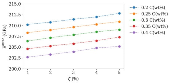 Therefore the mesoscopic modulus is first calculated as a function of precipitate volume fraction and carbon content using the microscopic model as homogenisation function f. This data serves as a preliminary result and is shown in Figure 2.
