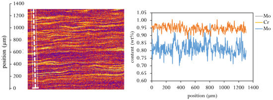 Segregation profile of Mo and Cr across a line scan (white line) detected using electron probe micro analysis (EPMA).