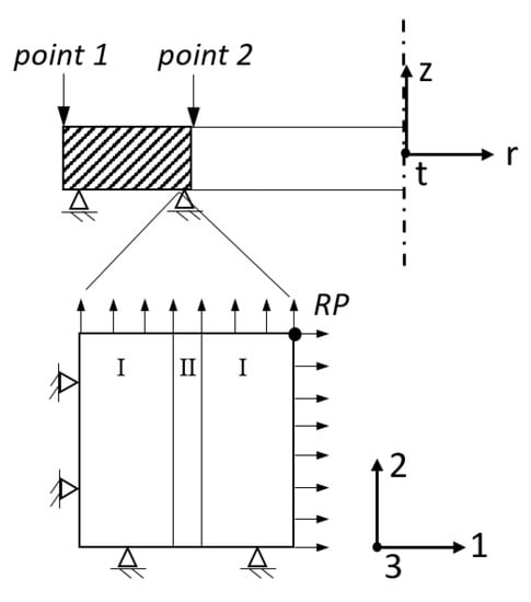 Schematic model description of the macroscopic axisymmetric process model with constant strain in axial direction ( = const.) and the submodel on the outer (point 1) and inner (point 2) tube’s surface as generalized plane strain model in direction 1, 2 and 3. In the submodel contains depleted regions (I) and segregated regions (II). The macroscopic boundary conditions are transferred via the reference point RP.