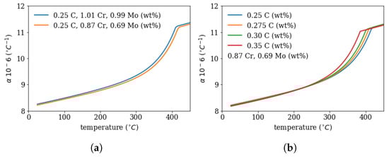 Figure 6. Calculated thermal expansion coefficient (with JMatPro) as function of temperature for different (a) Cr and Mo content for the depleted region I (0.87%Cr, 0.69%Mo) and for the segregated region II (1.01%Cr, 0.99%Mo) and (b) carbon content in the depleted zone. - The Young’s modulus in the segregated area is changed according to the carbon content, see Figure 5b following [16].