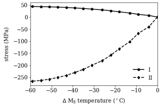 Residual stresses after cooling in depleted (I) and segregated (II) region for pure martensite as function of difference in martensite start temperature .