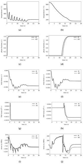 Results of mesoscopic submodel for (left) point 1 on the outer surface and (right) point 2 on the inner surface (see also in Figure 1): the temperature, phase fraction z, total strain in direction 3 (tangential direction in the macroscopic model), the TRIP strain and the resulting stress.