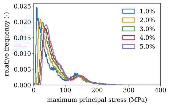 Histogram showing the relative frequency of maximum principle thermo-elastic stress after cooling for different precipitate volume contents .