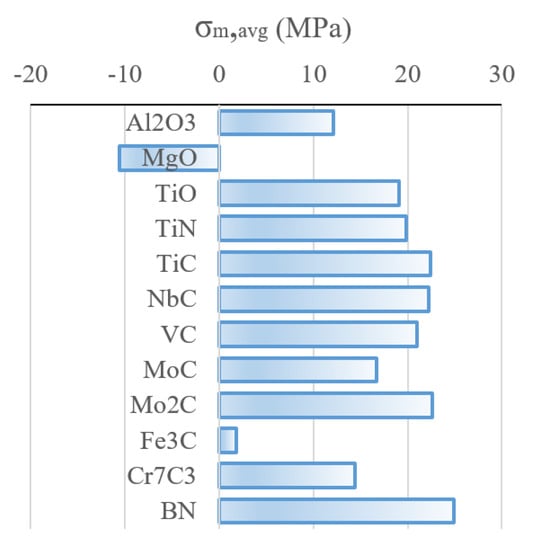 The relative stress formation potential (i.e., the average matrix stress of different inclusion types is given for an arbitrary volume fraction of 4%, to get a relative comparison between the species in Figure 9. Boron nitride BN shows the highest residual stress formation potential in steel based on thermo-elastic assumptions, followed by C, TiC, NbC and VC. Cementite C causes low residual stresses compared to the other precipitates. MgO would theoretically cause negative residual stresses, due to its larger thermal expansion compared to bcc Fe. However, depending on the interface properties of MgO and the Fe matrix, the negative residual stresses could lead to void formation.