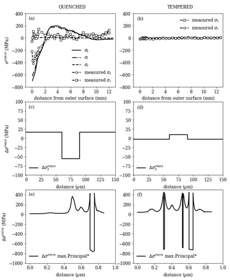 After tempering, with a thermal mismatch between the segregated and depleted region, stresses of ≤±25 MPa remain. The mesoscopic stresses act over wider ranges, but are small in size. After tempering, the segregated region is in tensile stress regime, since the thermal expansion in this region is higher than in the depleted region (compare Figure 6).