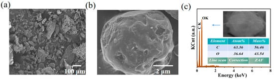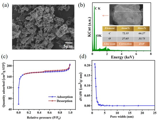 Figure 2a shows the SEM image of the YC skeleton obtained in the current work. Similar to other yeast-derived carbons in the literature [21], the macropores were observed on the surface of the YC skeleton after carbonization and activation. The YC is connected by holes with different pore sizes and has a relatively fluffy structure. Therefore, we speculated that the YC exhibited a large loading space for the adsorption of PCM. The EDS energy spectrum (Figure 2b) illustrated that the YC was mainly composed of C and O elements. The carbon content of YC was 66.27% and the oxygen content was 33.73%.