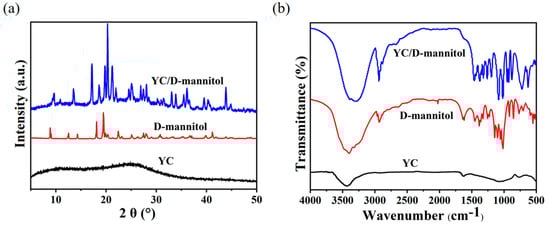 (a) XRD pattern, (b) FTIR spectrum of YC, D-mannitol, YC/D-mannitol.