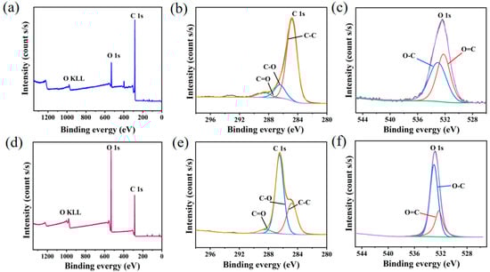In order to clarify the chemical state of the elements on the surface of YC before and after D-mannitol impregnation, XPS energy spectroscopy was performed. The C and O atom peaks were observed in the XPS survey spectra (Figure 5a,d) [30], which was in accordance with the EDS results. We further fitted the high-resolution XPS spectra of C 1s (Figure 5b,e) and O 1 s (Figure 5c,f). The C-C, C-O and C=O bonds were identified from the C 1s spectra at specific binding energies of 284.8 eV, 286.5 eV, and 288.5 eV, respectively. At the same time, in the O 1s spectra, the O-C and O=C bonds were determined at 533.0 eV and 532.2 eV, respectively. It is clear that the photoelectron peak of O1s in ss-PCM is significantly stronger than that of YC. Therefore, the O element content in ss-PCM is higher than that of YC. Combined with the EDS results, it can be concluded that a large amount of D-mannitol was retained in ss-PCM by vacuum impregnation.