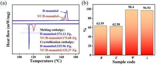 As shown in Figure 6b, the R reached 63.59%, while the ω of YC/D-mannitol was 65.60%, indicating the effective D-mannitol impregnation in the ss-PCM; almost all of the D-mannitol molecules were involved in the solid to liquid energy conversion. The E value (62.58%) proved that both the heat absorption and the exothermic processes were promoted in the ss-PCM. The Ψ value of YC/D-mannitol is 98.40%. Almost all of the D-mannitol molecular chains were embedded in the pores of the YC skeleton, enabling the phase change during the heat absorption and exothermic release. In addition, the adsorption force and nucleation sites provided by the YC supported efficient heat storage. The high specific surface area of YC provided enough phase transition space for D-mannitol molecules. In addition, the molecular chains were almost unconstrained during the phase transition process. Therefore, the D-mannitol could easily transfer from the amorphous phase to the crystalline phase. As a result, YC/D-mannitol has a high λ value (96.93%), high crystallinity, and a lower latent heat loss. The above results demonstrate that the YC carrier not only provides a suitable backbone for the preservation of D-mannitol, but also significantly improves the thermal properties of the ss-PCM.