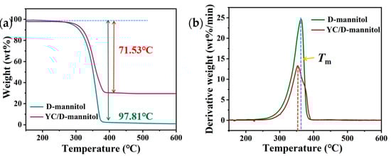 Considering the possible applications, the stability of YC/D-mannitol was investigated. As presented in Figure 7a, the initial thermal decomposition temperature of the pure D-mannitol was 283.5 °C, which was lower than that of the YC/D-mannitol (292.2 °C). Both pure D-mannitol and YC/D-mannitol were degraded in one step, with 97.81% of pure D-mannitol weight degradation occurring in the range of 275 °C to 375 °C. In contrast, 71.53% weight loss of YC/D-mannitol was observed between temperatures of 283 °C and 387 °C. As is shown in the DTG thermograms (Figure 7b), the Tmax values of pure D-mannitol and YC/D-mannitol were 351.74 °C and 364.23 °C, respectively. Therefore, the introduction of YC support could significantly improve the thermally stability of the D-mannitol as PCM. This phenomenon can be attributed to the multi-level pore structure of YC, which could effectively delay the thermal decomposition of D-mannitol.