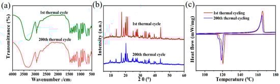 Long-term operation of the charging/discharging cycles of the YC/D-mannitol was conducted, in order to investigate the stability of the ss-PCM. The structure and properties of the recycled ss-PCM after 200 cycles were almost unchanged. This statement is reflected in the XRD and FTIR spectra (Figure 8a,b). As shown in Figure 8c, the DSC curves of the ss-PCM at the 1st and 200th cycles almost overlapped. Here, we may introduce the melting coefficient (ηm) and crystallization coefficient (ηc) to quantify the stability of the ss-PCM:
