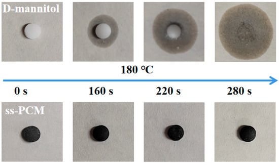 Leakage analysis was further conducted. Generally, in this process, the pure D-mannitol and ss-PCM were pressed into cylinders of 0.6 mm diameter and 0.2 mm height. The cylinder specimens were placed on a heating stage at 180 °C. The state of the specimens at different times was recorded by a digital camera (Figure 9). D-Mannitol gradually changes from solid to liquid and rapidly loses its shape, completely changing to a liquid state after 280 s of heating. The ss-PCM almost kept the original shape with only a trace amount of liquid leakage during the entire heating process. This was attributed to the molecular force provided by the YC skeleton.