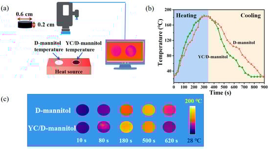 In order to visualize the thermal response behavior of the YC/D-mannitol, a homemade thermal infrared imaging platform was used (Figure 10a). During the heating process, samples were placed on the platform, and thermal infrared photographs were taken in the center of the specimens. As can be seen from Figure 10b, from the initial temperature, YC/D-mannitol and D-mannitol have to be heated for 160 s and 206 s before phase transition (the phase transition temperature was between 138 °C and 172 °C), and the phase transition temperature interval coincides with the DSC results. It took 770 s and 890 s for YC/D-mannitol and D-mannitol to cool down from the melted state to the initial state, respectively, and the heat storage and exothermic rates of YC/D-mannitol were significantly higher than those of D-mannitol. Therefore, YC could assist D-mannitol in rapid heat transfer. Through the record of the thermal infrared camera (Figure 10c), the YC/D-mannitol could be seen to exhibit good thermal responses.