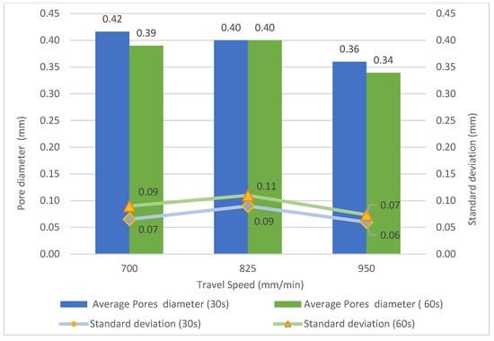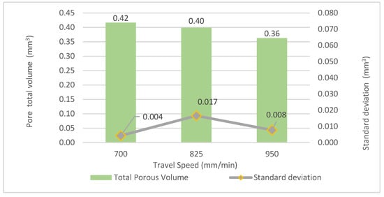 - The diameter of the pores slightly decreases with the increment of travel speed and cooling time. Thus, lower heat accumulation provided a positive outcome in terms of porosity. Specifically, the total pore volume decreases from 0.42 to 0.36 mm3, i.e., it decreases by 14% when increasing the travel speed from 700 to 950 mm/min.