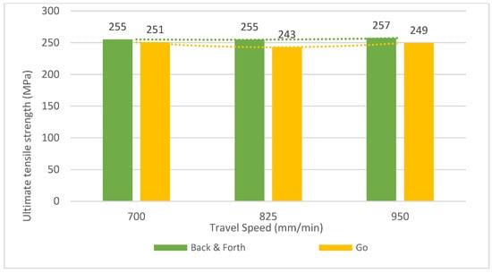 - There is almost no variation of ultimate tensile strength if the travel speed changes, but the best strategy was ‘Back and forth’. The maximum elongation was also higher when using the ‘back and forth’ strategy.