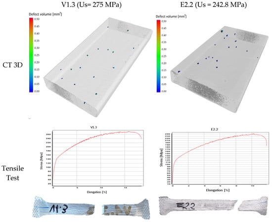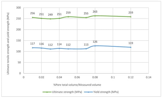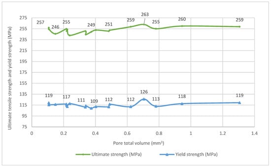 - The ultimate tensile strength and the yield strength were unrelated to the pore total volume. It should be highlighted that the percentage of the pore total volume over the measured volume was lower than 0.12% for all the scanned specimens.