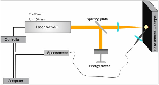 To generate the plasma, a pulse laser Nd:YAG (Brio model, produced by Quantel) was used (Bozeman, MT, USA). The tests were conducted with 1064 nm radiation generating 4 ns pulses. The plasma radiation was recorded using a spectrometer, enabling time-resolved measurements. An ESA 4000 echelle spectrometer (LLA Instruments GmbH& Co KG, Berlin, Germany) was used, which allowed the spectra to be detected in time windows of between 20 ns and 16 ms in the 200–800 nm spectral range. The detection part was the Kodak KAF 1001 CCD matrix with the ICCD amplifier embedded in the ESA 4000 device. The spectral resolution of the whole detection system was λ/Δλ~20,000.