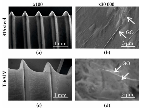 SEM image of the screw surface: (a,b) stainless steel 316 and (c,d) alloy Ti6Al4V (the arrows point the GO layers).