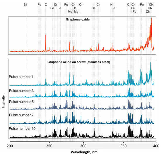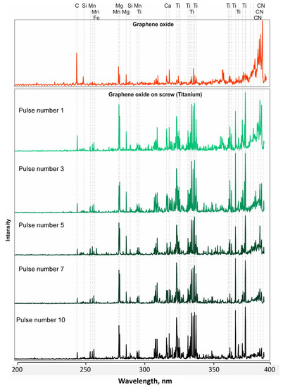 Selected stratigraphic spectra of graphene oxide (pulse numbers 1, 3, 5, 7, and 10) deposited on the surface of screws made from austenitic steel 316 (Figure 5) and titanium alloy Ti6Al4V (Figure 6) are presented below. These spectra were related to the spectrum of graphene oxide so that changes in the peaks depending on the next number in the laser pulse were visible. The spectrum obtained from graphene oxide was dominated by C and CN compounds, and admixtures were also visible, including elements such as Mg, Cr, and Ni. The strongest C peaks and CN bands were observed at only 1 pulse of the laser beam on a screw made from steel 316 (Figure 5). In Figure 5, we present a short-wavelength part of the LIBS spectra, namely in the 200–400 nm spectral interval. The entire spectral range in which spectra were recorded covered the 200–800 nm range, but the most visible changes in the spectra, i.e., intensities of carbon/graphene peaks or CN bands as well Fe and Ti lines, were easily found exactly in the 200–400 nm interval.