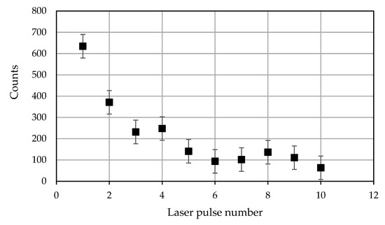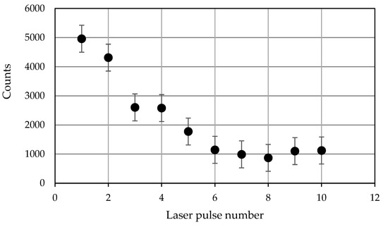 Figure 7 and Figure 8 illustrate changes in the intensity of carbon from deposited graphene oxide as a function of the laser shot number, i.e., deep into the surface layer. The analysis of the peak intensity showed that the strongest carbon peaks were observed in the first measurements for both a sample made from 316 stainless steel and one made from titanium alloy Ti6Al4V. Studies have shown that the highest peaks were observed for samples made from Ti6Al4V alloy, even for further laser shots. In addition, Figure 7 and Figure 8 show measurement errors resulting from fluctuations in the energy of the laser beam and signal reading by the detector.
