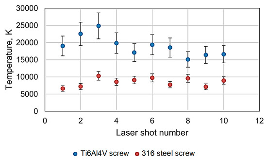Although the peak intensities varied significantly during stratigraphy experiments, the plasma temperatures did not change very much, especially for the 316 steel screw. This is shown in Figure 9 in which temperatures derived from Boltzmann plots are presented for the 316 steel and Ti6Al4V alloy screws. It is evident that the temperature for the Ti alloy screw was more than twice the value measured for the 316 steel screw (18,966 K vs. 8960 K—average values). This is due to the lower heat conductivity of titanium compared with steel (~6 W/m∙K for Ti6Al4V [17] vs. ~18–24 for 316 steel [18]). On the other hand, it has a higher absorption coefficient for 1064 nm with respect to steel (~65% for Ti vs. 30% for iron [19,20]).