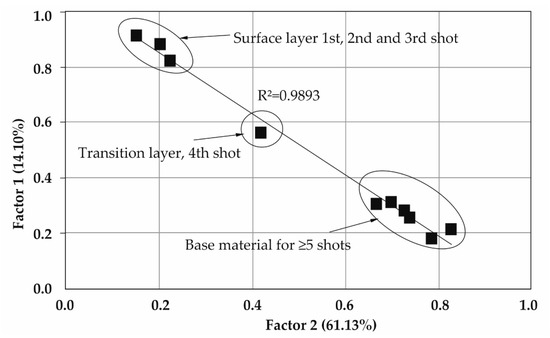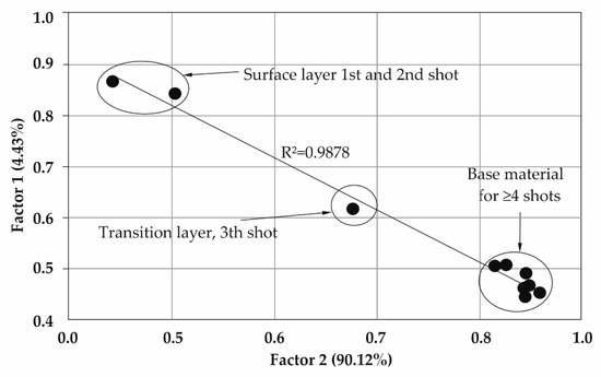 A factorial analysis of the LIBS spectra recorded for GO deposited on stainless steel 316 and alloy Ti6Al4V is shown in Figure 10 and Figure 11. In order to determine the incorporation of carbon (derived from deposited graphene oxide) into the surface layers, two groups of factors were used. Factor 1 was related to the depth in the sample increasing with the number of laser shots, while factor 2 represented the carbon/graphene density.