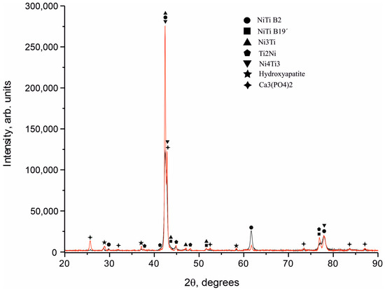 Diffraction spectra were obtained from NiTi samples coated with calcium phosphate targets (Figure 3). All samples were in a mixed structural state and consisted mainly of the TiNi phase in two crystallographic modifications of B2 austenite and B19’ martensite. In addition to the main structural lines, reflections from intermetallic phases of Ti2Ni and Ni3Ti were found in the spectrum. Coatings were formed as a mixture of two phases, Ca3(PO4)2 and Ca10(PO4)6(OH)2. The phases of tricalcium phosphate (Ca3(PO4)2) and hydroxyapatite (Ca10(PO4)6(OH)2) were found on the surfaces of all samples with a 100% degree of crystallinity. Amorphous X-ray scattering was not found in the X-ray diffraction pattern in the region of structural reflections. The high intensity of the reflection from the phase of tricalcium phosphate (Ca3(PO4)2) indicates its predominant content in the coating. Thus, Ca3(PO4)2 is the main structural component, and HA is a minor phase in the coating.