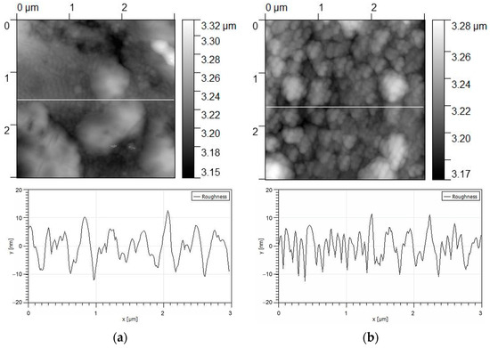 The surface topography of the coatings was studied by atomic force microscopy (Figure 6). The coating surface with a thickness of 0.5 µm is characterized by a grainy rough morphology with an average roughness parameter of 4.02 ± 2.3 nm and a grain size of 0.1 to 0.5 µm. The coating surface with a thickness of 2 μm has an average roughness parameter of 1.85 ± 1.6 nm and acquires an island topography with a size of 0.5 to 1 μm formed by coagulated grains.