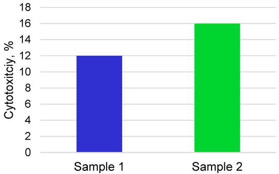 The study of the cytotoxicity of samples in mesenchymal stem cells using the MTT test after 24 h showed that the two series of samples have low cytotoxicity indices of 12 ± 2.3% and 16 ± 3.1%, respectively (Figure 8).