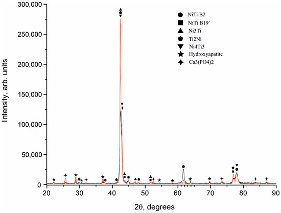 The samples were immersed in a standard tube containing 10 mL of physiological solution, which was preincubated at 37 °C for 30 min. Then, 0.2 mL of diluted blood was added to this standard tube, and the resulting mixture was incubated for 60 min at 37 °C. Similarly, 0.85% NaCl physiological saline was used as a negative control, and deionized water was used as a positive control. After that, all tubes were centrifuged for 5 min at 3000 rpm, and then the supernatant was transferred to a cuvette for spectroscopic analysis at a wavelength of −545 nm. Hemolysis was calculated using an ultraviolet spectrophotometer at 545 nm (Picon, Uniplan, Russia). To evaluate the biological activity of calcium phosphate coatings on TiNi substrates, samples were immersed in a solution that imitated the chemical composition of fluids in the body with a pH close to that of human blood plasma. After the solution was prepared, it was immediately heated to 37.5 °C, and carbogen gas was added to adjust the pH to 7.35, thus preventing sediment formation. The composition of the liquid was constantly adjusted by the automatic addition of distilled water. On day 30, the samples were removed and placed in an ultrasonic bath to remove any debris and dried at 180 °C for 2 h. The bioactivity of the coating was assessed by the formation of apatite layers during its immersion in the solution. The change in the volume fraction was determined from X-ray diffraction patterns.