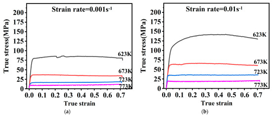 A uniaxial isothermal hot compression test was performed on the Gleeble 3180 thermo-mechanical simulator at strain rates of (0.001–1 s−1) and temperatures of (623–773 K). Cylindrical specimens with dimensions of Φ10 mm × 15 mm were used. In a thermal compression test, the specimen was heated at 5 K/s and maintained for 3 min after attaining a deformation temperature. It was finally compressed to 60% of the original height at a constant strain rate to collect stress-strain data [25,26], as shown in Figure 1. Four strain rates (0.001 s−1, 0.01 s−1, 0.1 s−1, 1 s−1) and four isothermal points (623 K, 673 K, 723 K, 773 K) were designed.