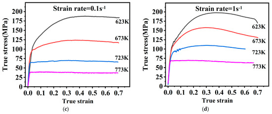 The flow stress gradually grows in response to strain rate rise and temperature decrease. The flow stresses are mainly dictated through a dynamic interaction of work-hardening and softening mechanisms. Rising temperatures and declining strain rates facilitate the emergence and growth of DRX grains. At this time, the softening mechanism is strengthened, and the stress drops. In addition, in Figure 2d, at 723 K, there are small serrations in the yielding stage. This is related to the dynamic strain aging effect resulting from interactions of the alloy solute atoms with dislocation motion. A similar observation was reported by Zhang [27].