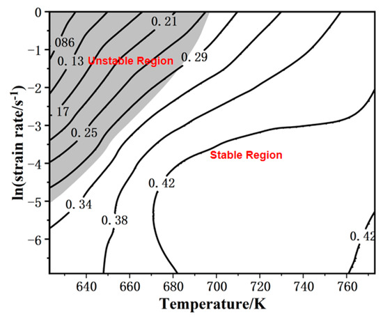 The energy dissipation rate map and instability map are available by calculating the test data with Equations (1) and (2). The hot processing map of the magnesium alloy can be drawn by combining these two maps (Figure 3).