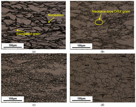 Figure 4a–d demonstrates the sample’s microstructure with deformation temperatures of 623–773 K at 0.01 s−1. Figure 4a indicates primitive grains are stretched perpendicular at the deformation orientation (CD). There is a clear nucleation near the original grain boundaries for temperatures at 623 K. As seen in Figure 4b, the nucleation gradually grows and presents a typical necklace-type DRX grain along the primitive grain boundary when the temperature reaches 673 K. As seen in Figure 4c, the DRX grains almost replaced the original grains when the temperature reached 723 K. As seen in Figure 4d, when the temperature reached 773 K, the DRX grains enlarged further until the primitive grains were replaced entirely.
