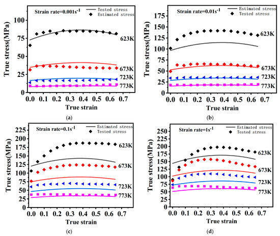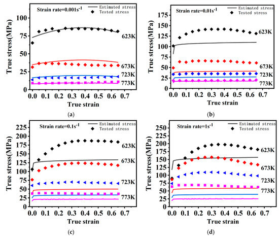 The tested stress and estimated stress by the NM–JC model are presented in Figure 11. The NM–JC model involves strengthened coupling effects that can effectively predict flow behaviors at 623–773 K and 0.001–1 s−1.