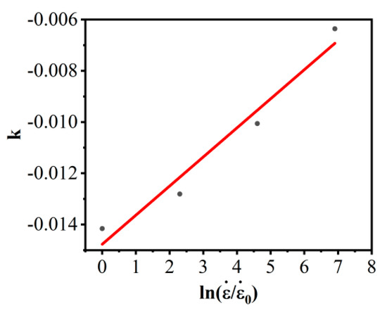 According to the relationship of and , the corresponding parameters k can be solved. When the strain rate is 0.001 s−1, 0.01 s−1, 0.1 s−1, and 1 s−1, the corresponding parameters k are −0.01416, −0.01281, −0.01006, and −0.00636, respectively. The correlation of k and is shown in Figure 8. Then , can be computed as −0.0148 and 0.00114, respectively.