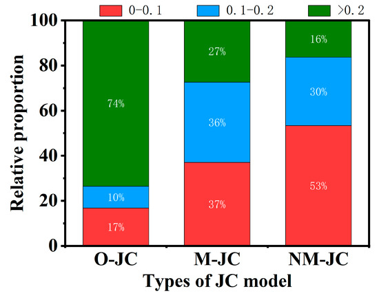 This study involved 224 stress-strain sample points in calculating the constitutive model. Figure 12 shows the relative proportion of the range of RE values for the three different JC model prediction values. Compared with the O–JC model and M–JC model, the RE values for NM–JC model prediction values in the range of 0–0.1 increased significantly. In contrast, the RE values greater than 0.2 decreased significantly. The RE values for NM–JC model prediction values in the range of 0–0.1 accounted for 53%, in the range of 0.1–0.2 accounted for 30%, and only 16% were greater than 0.2.