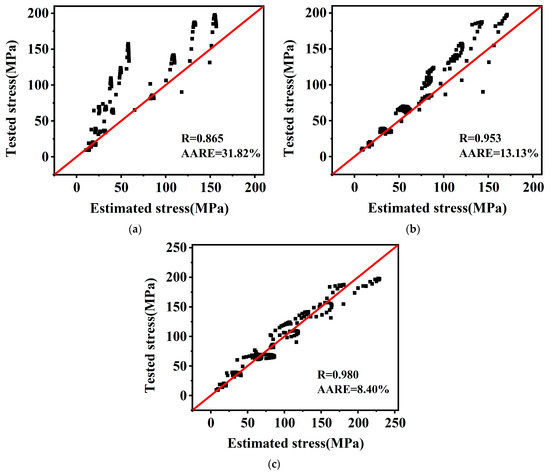Correlation between tested and estimated flow stresses: (a) O–JC model; (b) N–JC model; (c) NM–JC model.