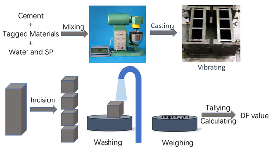 In this paper, “tagged” materials are used to simulate cement particles and other particles in the paste [4]. These materials are insoluble in water and have a similar particle size as cement particles. After vibration, the tagged materials are separated from different parts of the cement block by washing with water and screening, allowing us to observe the particle distribution in the cement paste. The feasibility of using tagged materials to explore the distribution and movement patterns of cement particles under vibration is evaluated, and the correlation between the vibration procedure (time and frequency) and the properties of the cement paste are discussed, which is essential for optimizing the design and performance of cement-based materials.