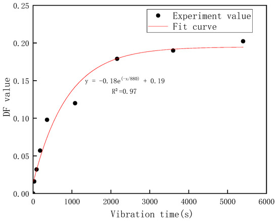 Figure 3 shows the graph of DF values changing with vibration time, it can be seen that with the increase in vibration duration, the overall DF calculation value gradually increases. The DF value is used to characterize the dispersion of the distribution of tagged particles between the different layers. At this time, because of the occurrence of vibration, the yield stress of the cement paste decreased, and the particles were subjected to gravity to settle in the paste, resulting in a certain uneven distribution within the paste, and the result shows that the DF increases with time. When the vibration time was 0, the calculated DF value was very close to 0, which was in accordance with the expected result. When the cement paste was not subject to vibration, it possessed a certain yield stress. According to the research of Petrous et al. [4], even in the absence of vibration, it was difficult for high-quality aggregate or materials with higher densities than the aggregate to induce motion, even when their volume was the same. The added material was uniformly distributed in the paste at the vibration time of 0. As time went on, the rate at which the discrete distribution of marked particles increased gradually slowed down as the settle range of particles was limited, and the internal structure of the cement paste changed, causing a gradual change in yield stress and a gradual slowdown in the trend of the movement of material particles. These factors all contributed to the gradual decline in the growth rate of the DF value. The use of tagged particles has allowed researchers to discover that small particles with similar size and density to cement particles can move within cement paste when subjected to vibration. Even short periods of vibration, less than 180 s, can cause these particles to move vertically in a directional manner, although this may not be easily observable. However, after prolonged vibration for 2000 s or longer, this directional motion becomes more apparent, resulting in phenomena such as bleeding and bubble discharge in the cement substrate [9,24]. This suggests that long-term vertical vibration can cause the distribution of substances other than solid particles to become oriented.