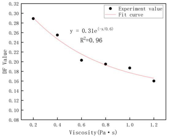 As can be seen from Figure 4, the degree of dispersion of the tagged particles presents a negative power function of the natural base with the viscosity. When the viscosity was 0.2 Pa·s, the value of the particle distribution dispersion degree (DF) was 0.29, indicating that there was a significant unevenness in the distribution of the tagged particles at this time, suggesting that the particles had undergone large-scale motion within the cement paste during this period, and as the viscosity increased, the DF value gradually decreased, indicating that particles became increasingly difficult to move in the higher viscosity environment. The ease of motion of the tagged particles is related to the viscosity of the cement paste. Previous research [11] has demonstrated that moving particles in non-coagulated cement paste experience friction. The strength of the adhesion between particles determines their ability to impede the flow of cement paste and results in a greater frictional force on particle movement. This adhesive property is known as viscosity. When subjected to vibration, the yield stress of cement paste decreases, making the motion of tagged particles easier. This motion is facilitated by a combination of factors, including the mixing action, gravity, frictional forces, and the viscosity of cement paste. The greater the frictional force on the tagged particles, the more challenging their motion becomes [25]. This is similar to the research conclusions drawn by previous scholars on the movement of aggregates and fibers, indicating that the primary mechanism of solid phase movement in cement-based slurries is similar [18,26,27].