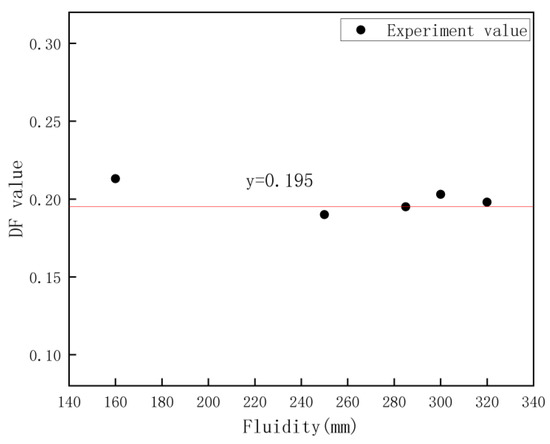 The relationship between the DF value and the flowability of the cement paste can be seen in Figure 5, where all the data are around a horizontal straight line, which means that in the case of similar viscosity of the cement paste, even if there is a large difference in the flowability of the cement paste, the ease of movement of the marked particles in it is comparable in the vibrating state. The presence of a large number of hydrophilic groups on the surface of the composite particles and the strong ability of the hydrophilic groups to adsorb water molecules made the movement of the tagged particles in the cement paste easier as some of the particles in the cement paste became the bigger particles with a surface covered with water molecules. It leads to easier movement of the tagged particles in the cement paste in the low viscosity state, exhibiting a more uneven distribution of the tagged particles.